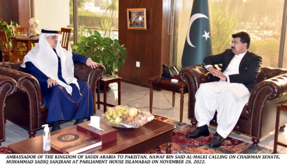 ISLAMABAD -UNS :- Pakistan and the Kingdom of Saudi Arabia (KSA) have expressed the desire to further strengthen long-standing fraternal ties which are based on common religion, shared values and culture. This was discussed at a meeting between Chairman Senate, Muhammad Sadiq Sanjrani and the Ambassador of Saudi Arabia to Pakistan, Mr Nawaf bin Saeed Ahmad Al-Malkiy, at Parliament House, today.