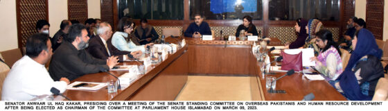 ISLAMABAD-UNS :Senator Anwar ul Haq Kakar Unanimously Elected as Chairman of Standing Committee on Overseas Pakistanis and Human Resource Development,on Thursday. A meeting of the Senate Standing Committee on Overseas Pakistanis and Human Resource Development of the Upper House was held here at the Parliament House on Thursday to elect the Chairperson of the Committee. During the meeting, Senator Prince Ahmed Omer Ahmed Zai proposed the name of Senator Anwar ul Haq Kakar as Chairman of the committee which was seconded by Senator Rana Mahmood ul Hassan.