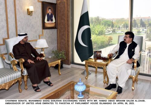 The Chairman Senate expressed Pakistan’s commitment to further strengthen its relations with the UAE in all areas of common interest. The Ambassador of UAE appreciated Pakistan’s development-oriented economic policies initiated by the government.