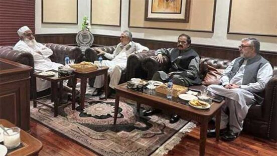 ISLAMABAD -UNS: Federal Finance Minister Ishaq Dar and Interior Minister Rana Sanaullah met Pakistan Democratic Movement (PDM) chief Maulana Fazlur Rehman on Sunday to request that the PDM should not hold a protest outside the Supreme Court.
