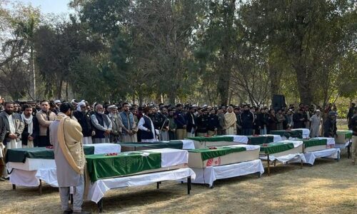 In the evening, funeral prayers of the martyred cops were offered at the Dera Ismail Khan Police Lines. Caretaker KP Chief Minister Justice (rtd) Arshad Hussain Shah, Chief Secretary Nadeen Aslam Chaudhry, KP police chief and other senior civil and military officials attended the funeral.