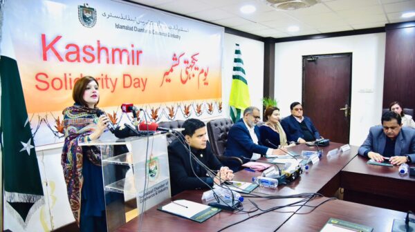 ISLAMABAD -UNS: Special Assistant to the Prime Minister for Human Rights and Women Empowerment, Mushaal Hussein Mullick, has highlighted India’s role in regional instability, attributing it as a major obstacle to economic progress within the region. She was addressing an event organized by Islamabad Chamber of Commerce and Industry (ICCI) held in connection with Kashmir Solidarity Day. The event was also addressed by President ICCI Ahsan Zafar Bakhtawar, Senior Vice President ICCI Faad Waheed, Vice President ICCI Engr. Azhar-Ul-Islam Zafar and many other dignitaries. Focal Person to SAPM Sabien Hussein Mullick and members of executive committee of Islamabad chamber of Commerce and Industry also attended the event. Special Assistant to the Prime Minister expressed appreciation for the unwavering support of Pakistan’s business community for the just and noble cause of the Kashmiri people.