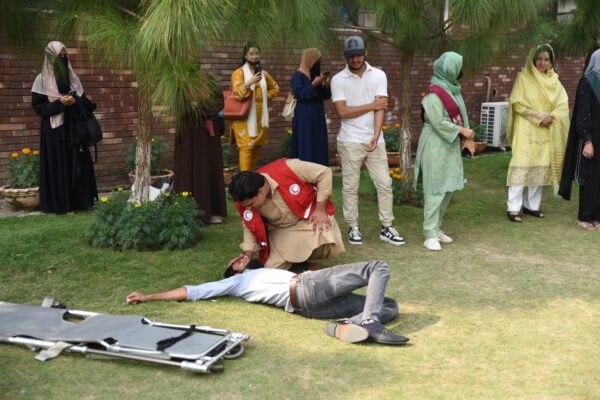 Mr. Muhammad Ibrahim, Assistant Director, Disaster Preparedness at Pakistan Red Crescent, an esteemed NUML alumnus, along with his team, conducted a hands-on training session. The session focused on first aid techniques and disaster response strategies, demonstrating lifesaving procedures that are crucial in emergencies. Mr. Ibrahim emphasized the importance of disaster preparedness, highlighting how timely actions can save lives.