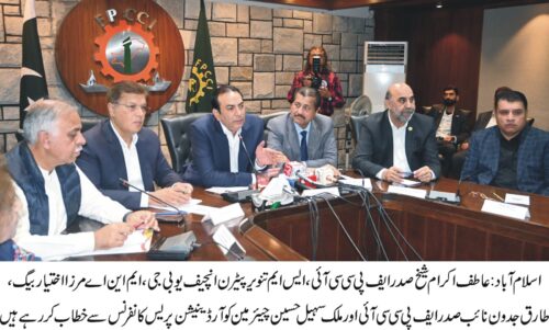 ISLAMABAD -UNS: President Federation of Pakistan Chamber of Commerce and Industry Atif Ikram Shaikh along with Patron Chief UBGSM Tanveer, Member National Assembly Mirza Akhtar Baig, Vice President Tariq Jadoon, Muhammad Ashfaq, Chairman Capital Office Karim Aziz Malik, Chairman Coordination Malik Sohail, Javed Iqbal, Akhtar Kakar, President Women Chamber Samina Fazal and others have said that export targets can be achieved only by solving the energy crisis, business community. The price of electricity has been reduced by four to five rupees, the electricity rate in the region is 6 to 7 cents and in Pakistan it is 15 cents, the policy rate should be single digit and at least 8%.