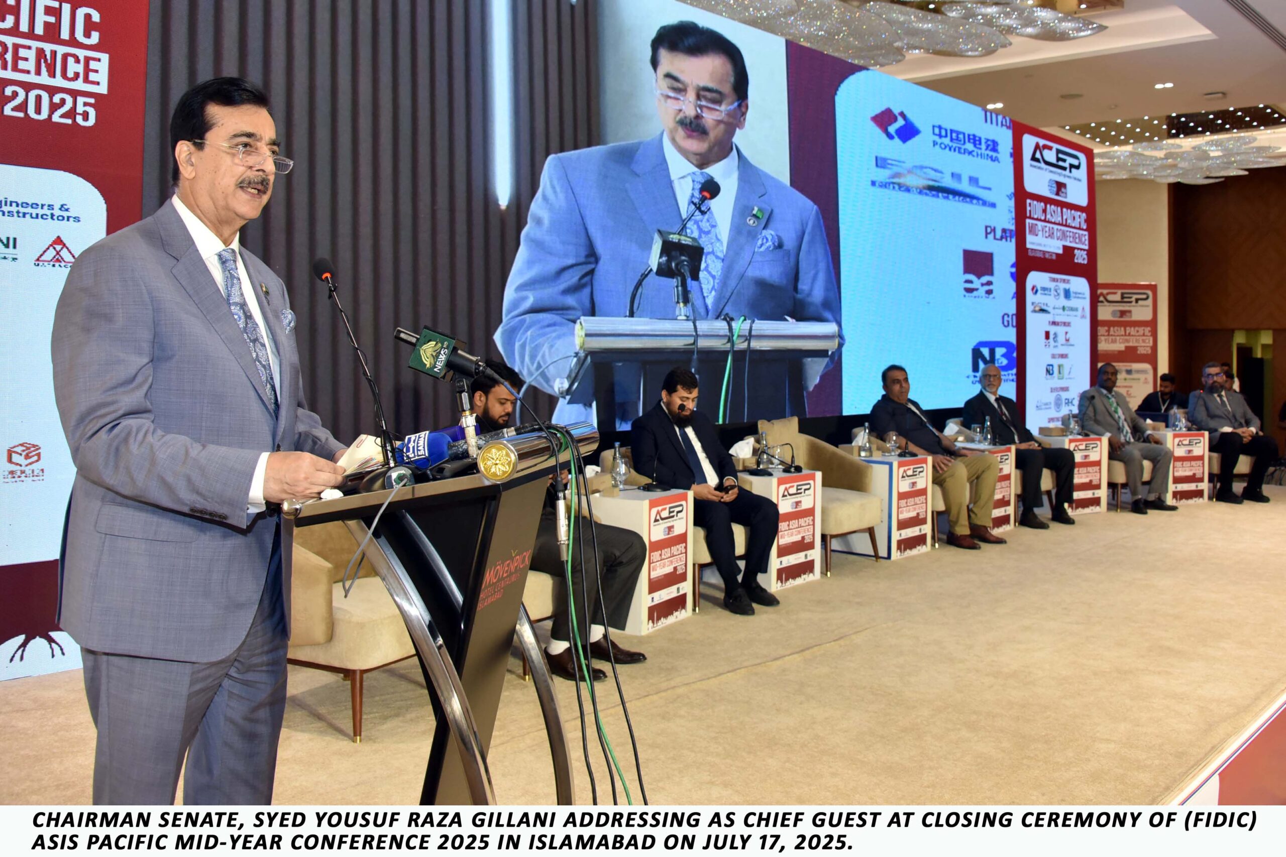 ISLAMABAD-UNS: Chairman Senate Syed Yousaf Raza Gilani observed that sustainable progress requires strong institutions and open systems to deliver better services to the people of Pakistan while ensuring transparency and accountability. He was addressing closing ceremony of International Federation of Consulting Engineers FIDIC Asia-Pacific Mid-Year Conference 2025 as Chief Guest in Islamabad.