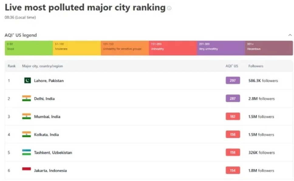 Lahore was followed by New Delhi (287), Mumbai (182) on the global pollution chart. Other cities in the top 10 included Kolkata (158), Tashkent (158), Jakarta (154), Dhaka (152) and Dubai (152), with three Indian cities in the top five.